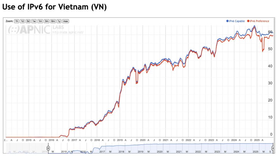 Theo số liệu từ APNIC Labs, đơn vị nghiên cứu về Internet châu Á - Thái Bình Dương, trong tháng 9, tỷ lệ sử dụng IPv6 tại Việt Nam đạt 61,2%. Dù tỷ lệ liên tục thay đổi, Việt Nam nhiều năm nằm trong top 10 toàn cầu về chuyển đổi sang IPv6, đứng thứ hai khu vực Đông Nam Á.